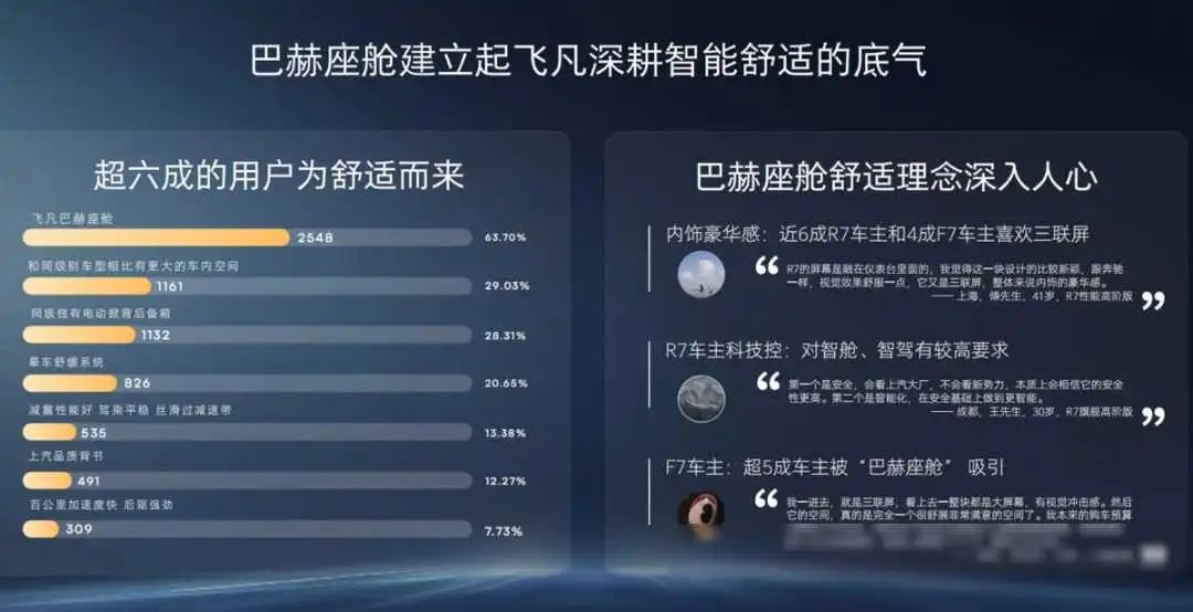 针对新能源汽车市场的同质化问题,各大厂商开始积极探索差异化发展的道路。例如,飞凡汽车通过对用户需求的深入洞察,发现了一些积极的信号。据数据显示,飞凡F7上市半年来获得了大量用户的认可,其中舒适性成为了大部分用户选择F7的首要因素,超过了63.7%的用户表示受到了飞凡的巴赫座舱吸引。这表明消费者在选择汽车时越来越注重舒适性和智能化配置,而不仅仅是传统的性能指标和外观设计。