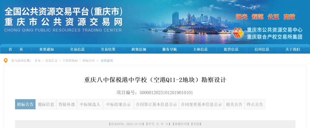 据2023年12月23日发布的《重庆八中保税港中学校(空港Q11-2地块)勘察设计招标公告》显示,重庆八中保税港中学校由Q11-2地块、Q12-1地块组成,重庆八中保税港中学校总体占地面积约8.32万平方米,