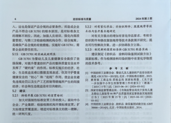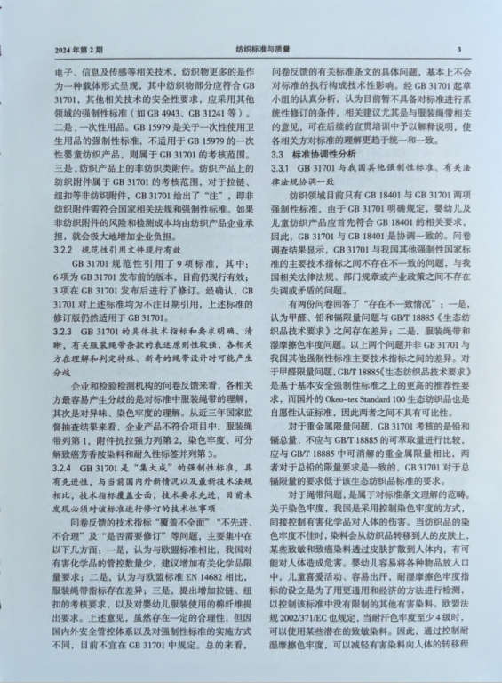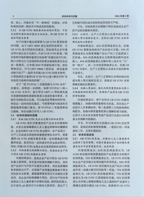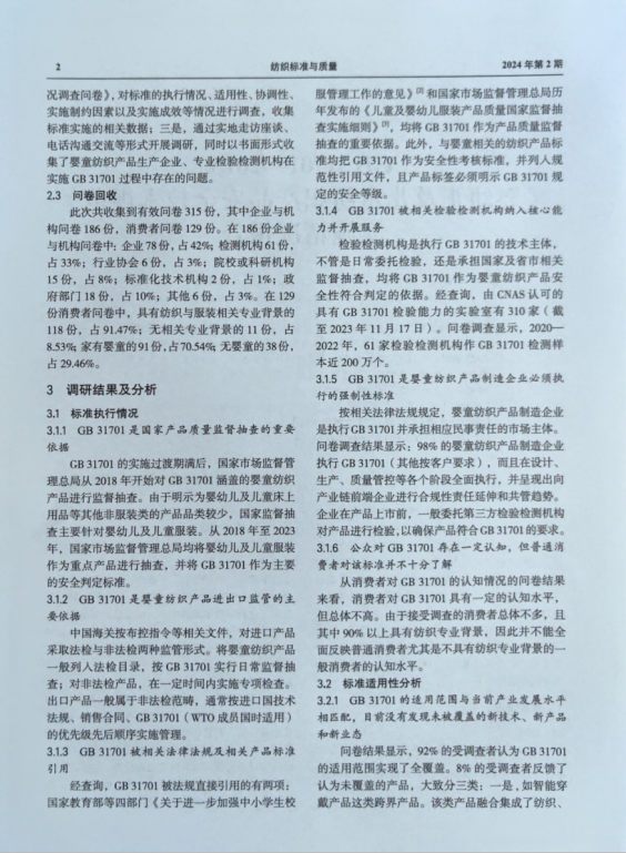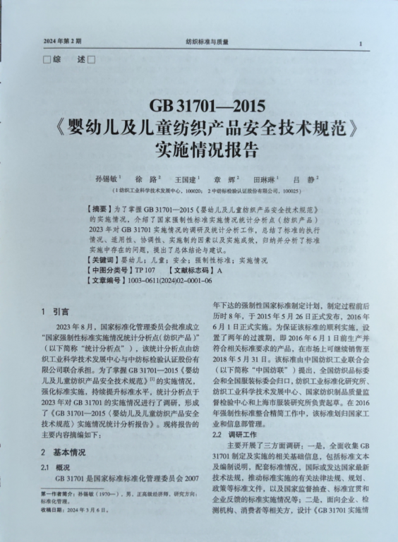 2023年8月,国家标准化管理委员会批准成立“国家强制性标准实施情况统计分析点(纺织产品)”,该统计分析点由纺织工业科学技术发展中心与中纺标检验认证股份有限公司联合承担。为了掌握GB 31701—2015《婴幼儿及儿童纺织产品安全技术规范》的实施情况,强化标准实施,持续提升标准水平,统计分析点按照国家标准委的统一部署,于2023年对GB 31701的实施情况进行了调研,形成了《GB 31701—2015<婴幼儿及儿童纺织产品安全技术规范>实施情况统计分析报告》。统计分析点将报告的主要内容进行了摘编,并在《纺织标准与质量》2024年第2期公开发表。现通过“直八说”公众号平台推送,请各位专家批评指正(如有意见和建议,请反馈至邮箱:cttrc@126.com)。
