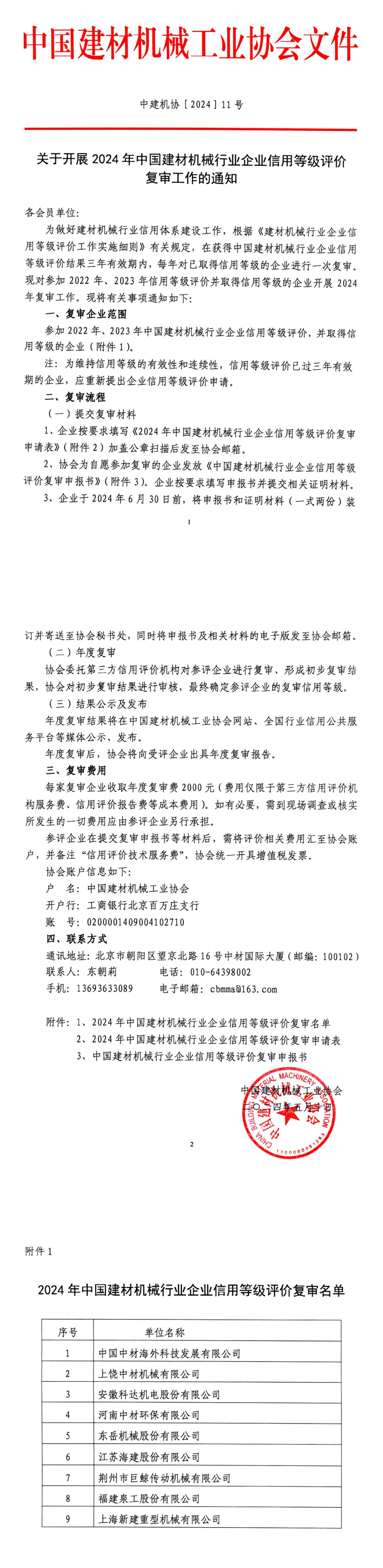 中建机协[2024]11号关于开展2024年中国建材机械行业企业信用等级评价复审工作的通知.pdf