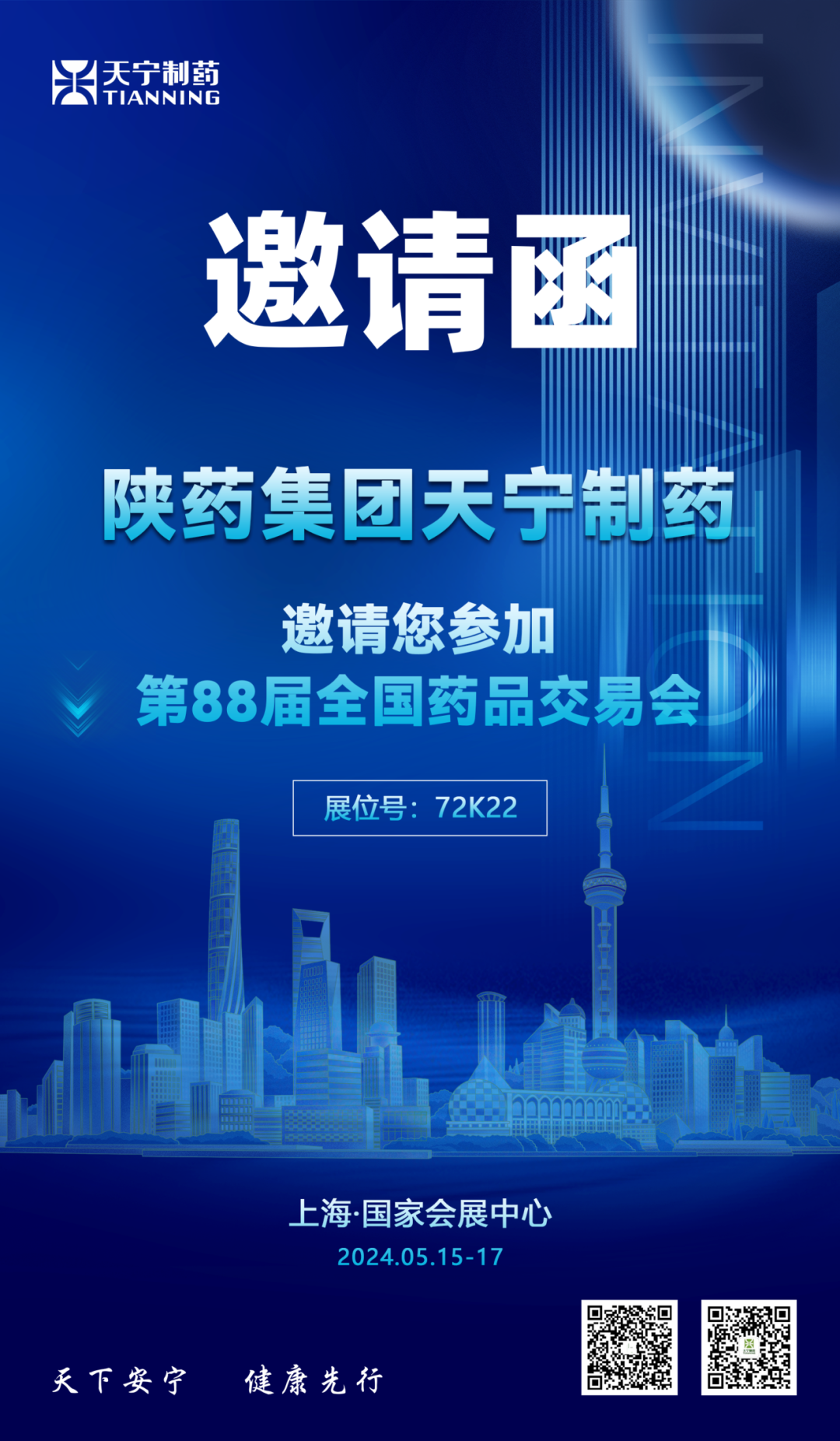 您好!感谢您一直以来对陕药集团天宁制药的支持与信赖!我们诚挚邀请您参加2024年5月15日至17日在上海·国家会展中心召开的第88届全国药品交易会。