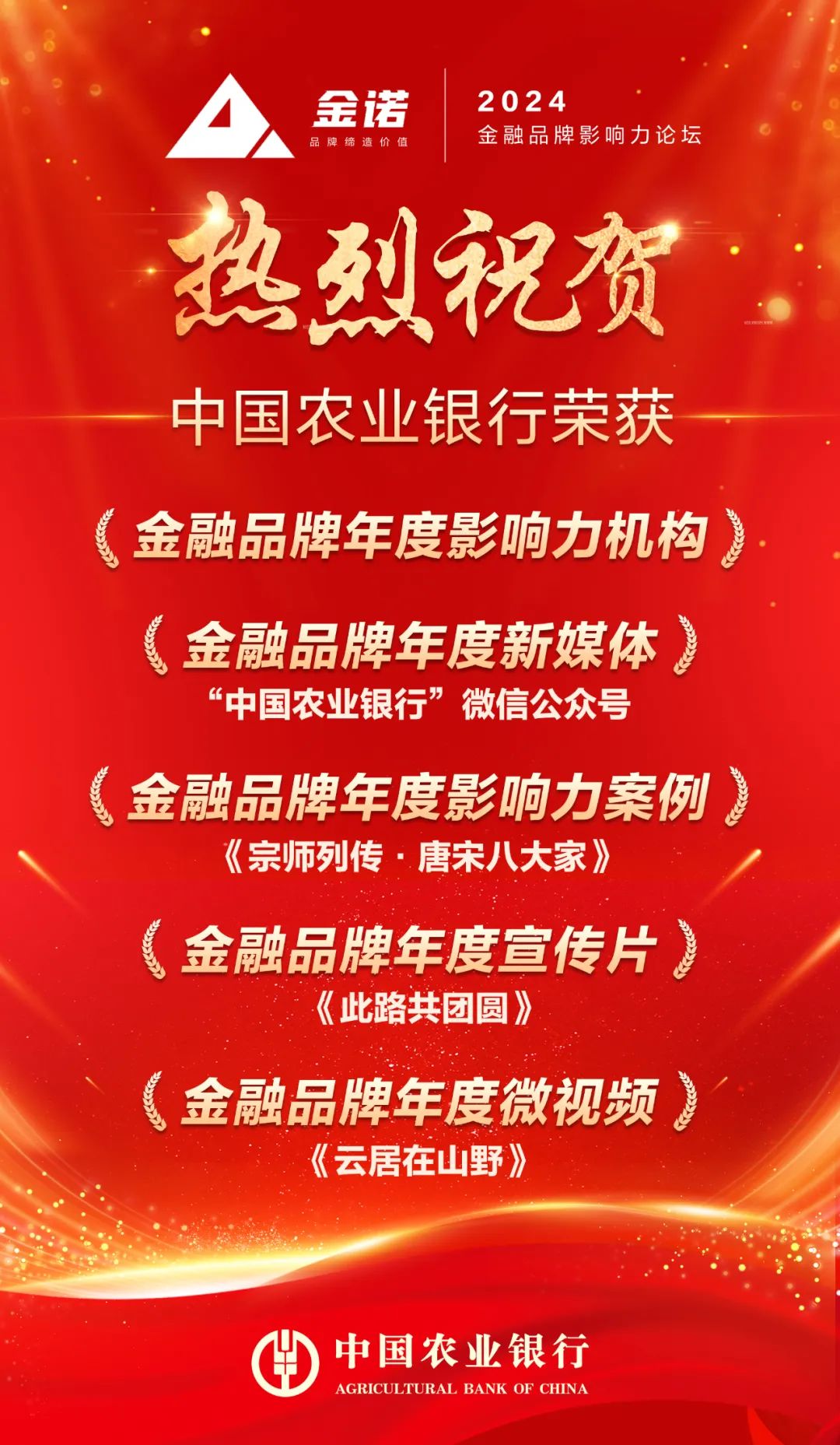 5月9日,2024金诺·第八届金融品牌影响力案例榜单正式发布,农业银行凭借优秀的品牌影响力和新媒体运维能力,荣获“金融品牌年度影响力机构”“金融品牌年度新媒体”“金融品牌年度影响力案例”“金融品牌年度宣传片”“金融品牌年度微视频”等五项大奖。