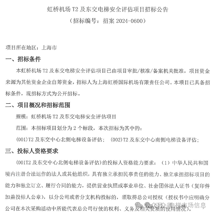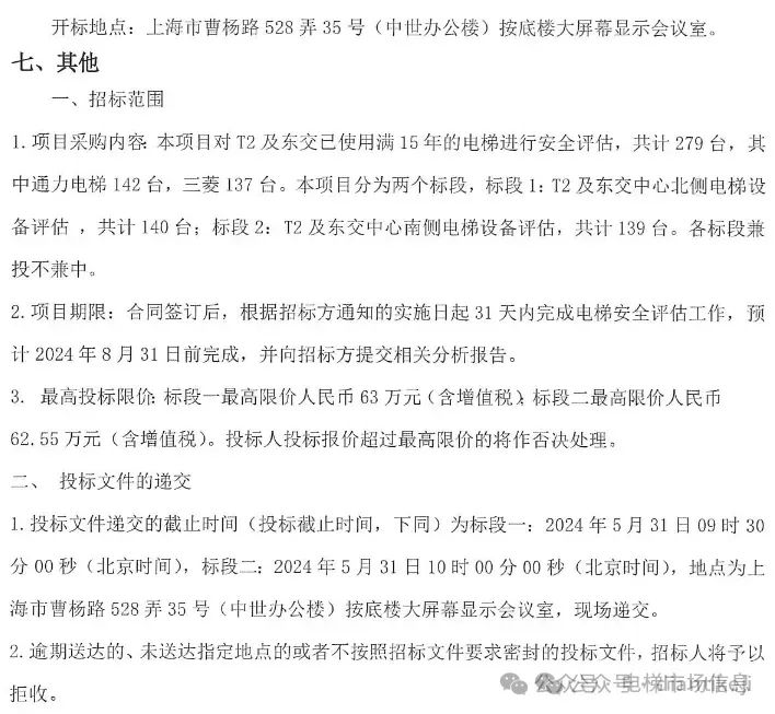 虹桥机场T2及东交电梯安全评估项目招标:279台电梯安全评估,预算125.55万,其中通力电梯142台,三菱电梯137台