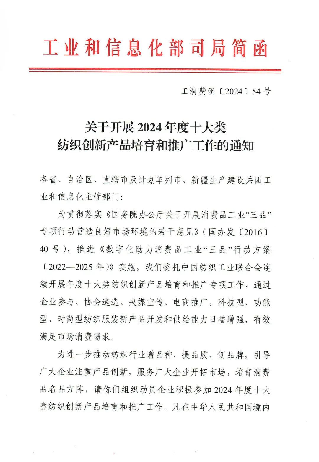 为进一步推动纺织行业增品种、提品质、创品牌,引导广大企业注重产品创新,服务广大企业开拓市场,培育消费品名品方阵,工业和信息化部消费品工业司和中国纺织工业联合会相继印发了“关于开展2024年度十大类纺织创新产品培育和推广工作的通知”。据悉,该项工作的网上申报阶段将于5月31日截止。