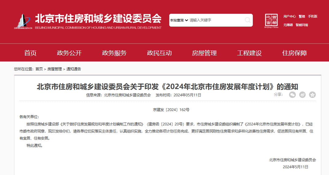 5月11日,北京市住建委发布《2024年北京市住房发展年度计划》。根据计划,今年计划供应配租型和配售型保障性住房用地200公顷,计划供应商品住房约600万平方米。