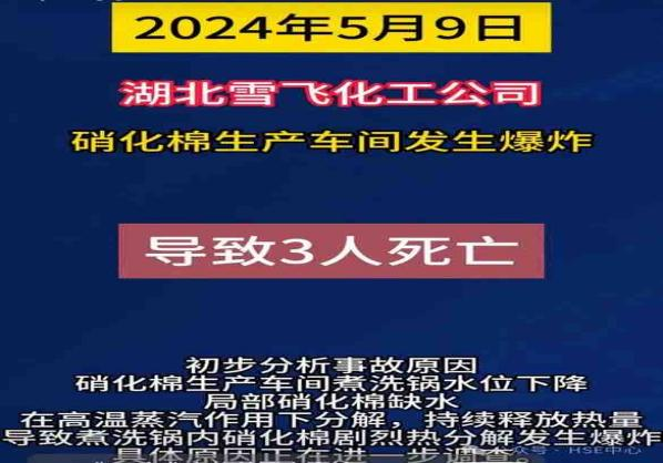 2024年5月9日,湖北雪飞化工公司硝化棉生产车间发生爆炸,造成3人死亡,初步分析事故原因是硝化棉生产车间1#煮洗锅水位下降,局部硝化棉缺水,在高温蒸汽作用下分解,持续释放热量,导致煮洗锅内硝化棉剧烈热分解发生爆炸。具体原因正在进一步调查。