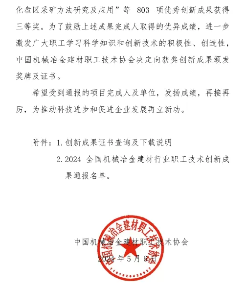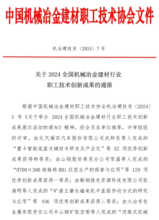 2024 全国机械冶金建材行业职工技术创新成果“三等奖”。