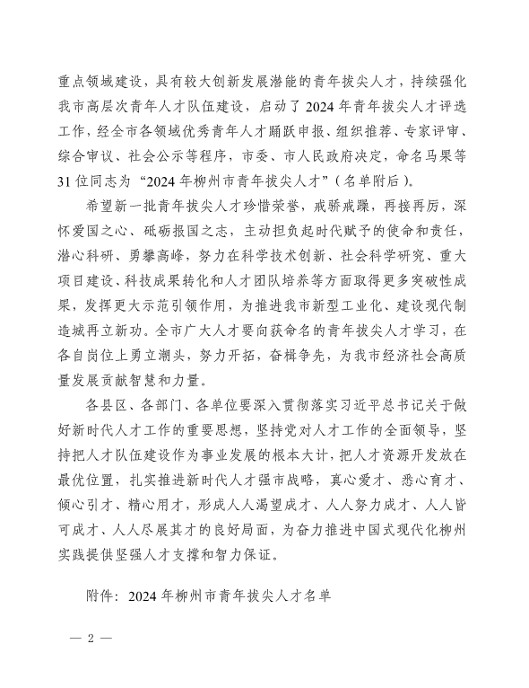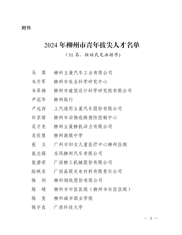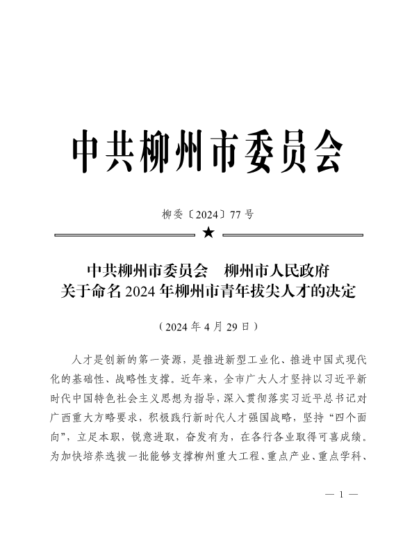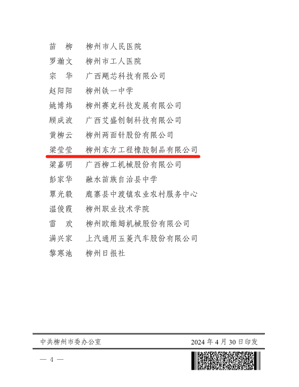 此外,4月30日,经市委、市政府同意,柳州市31位同志获评为2024年柳州市青年拔尖人才,我区柳州东方工程橡胶制品有限公司结构分析所所长梁莹莹获评“柳州市青年拔尖人才”。