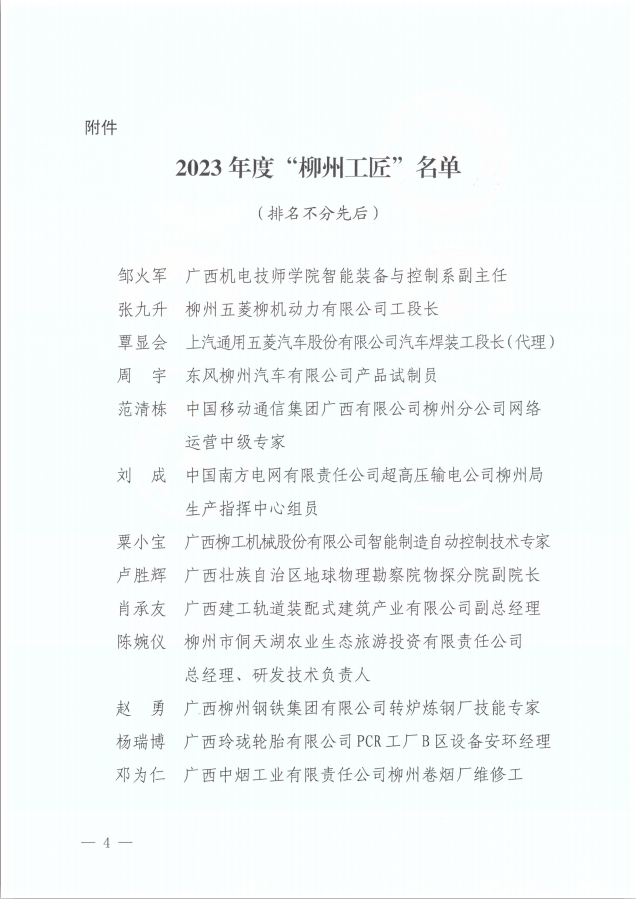 自2022年起,柳州通过法定程序将每年4月26日设为“柳州工匠日”,以一城之名致敬工匠。在今年的4月26日“柳州工匠日”之时,经基层推荐、专家评审、组委会审定和社会公示,柳州市命名20名同志2023年“柳州工匠”称号。其中,鱼峰区柳州源创电喷技术有限公司首席工艺开发员梁焕勇获评“柳州工匠”。