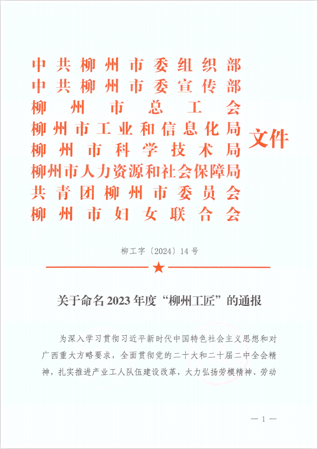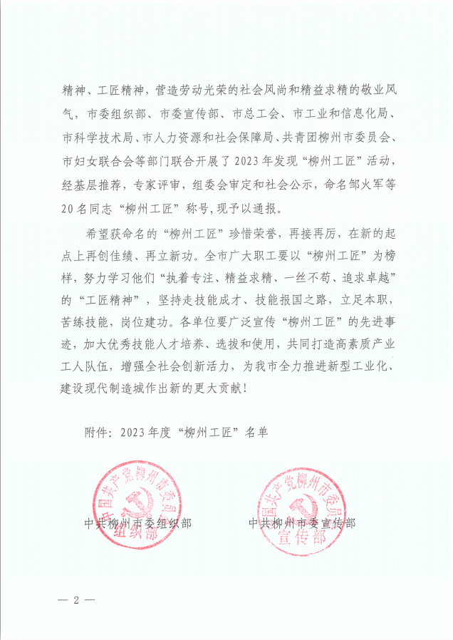 近日,鱼峰区人才工作喜讯频传,2人分别获评2023年度“柳州工匠”和2024年柳州市青年拔尖人才。