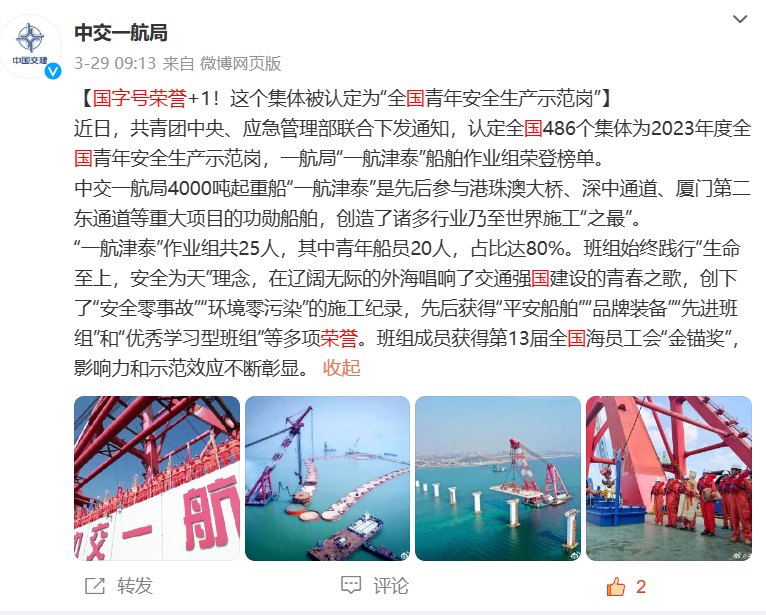 “一航津泰”船舶作业组获评“全国青年安全生产示范岗”的消息登上集团报三版版面,以“一航津泰”为代表的航一船舶团队,始终践行“生命至上,安全为天”理念,在蔚蓝海洋唱响交通强国建设的青春之歌。在一航局微博,《国字号荣誉+1!这个集体被认定为“全国青年安全生产示范岗”》擦亮了公司品牌。