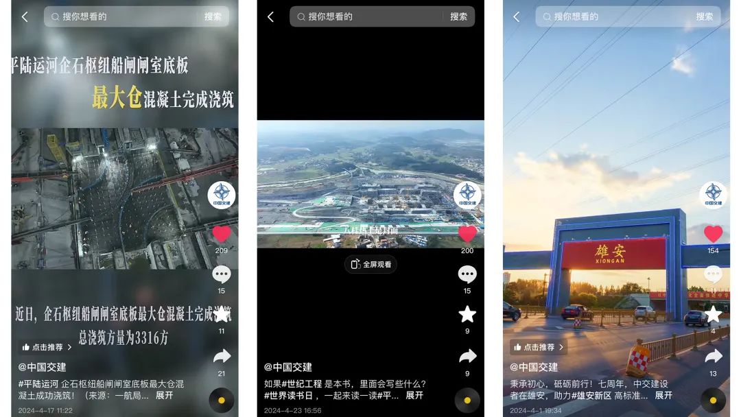 在集团抖音,平陆运河项目部将《平陆运河企石枢纽船闸闸室底板最大仓混凝土成功浇注》搬上屏幕、扩大传播,并创新视听形式,呼唤读者思考《如果世纪工程是本书,里面会写些什么?》;雄兴快线项目部参与进《雄安新区7周年重点工程回顾》,彰显公司在“千年大计”中的使命担当。