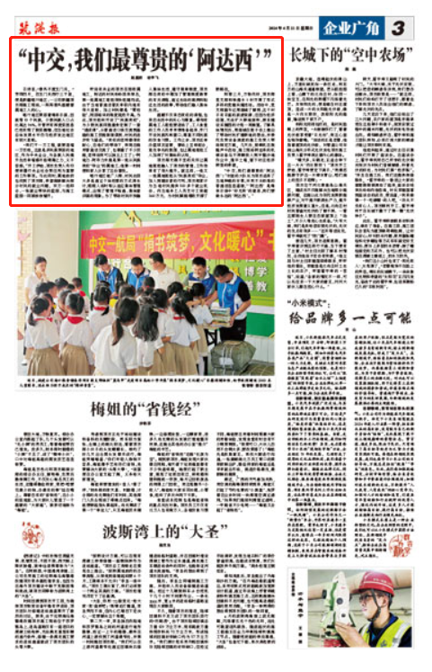 在新疆喀什地区,航一人接过援疆接力棒,通过推行属地化用工模式、对村庄设施改造提升,让少数民族《村民在家门口就业增收》,一系列帮扶举措让村民向建设者表达诚挚的感谢:《“中交,我们最尊贵的‘阿达西’”》。