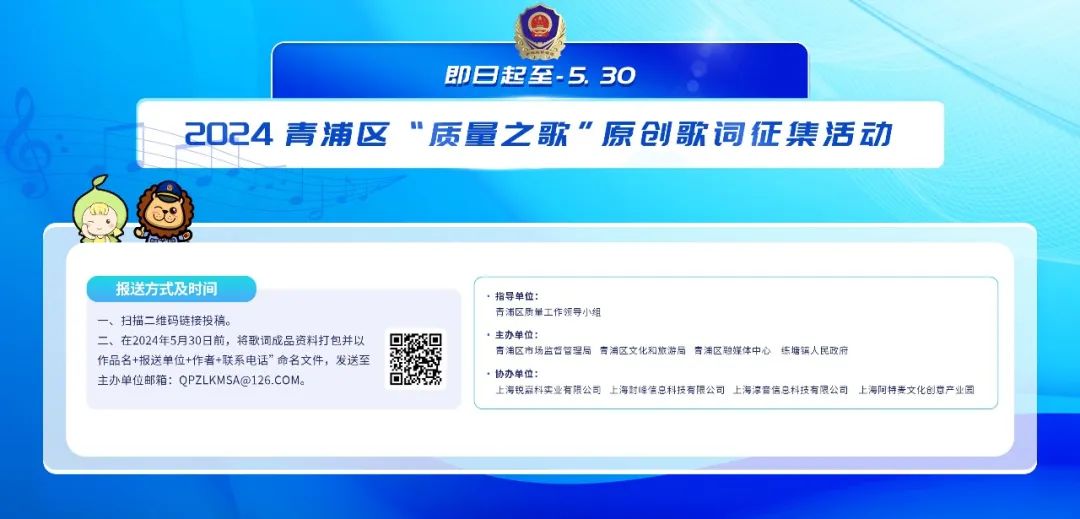 为进一步唱响文化赋能青浦高质量发展的主旋律,用音乐赋能群众性质量文明,用歌声传唱“绿色青浦 质量成就”的青浦质量精神、品牌发展成果,传播质量故事,塑造质量品牌,展示质量成就,青浦“质量之歌”原创歌词征集活动正在火热进行中,快来扫码投稿吧~~