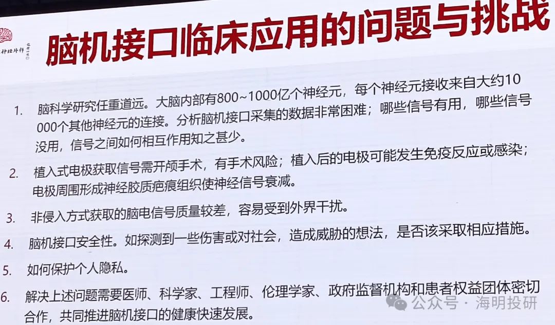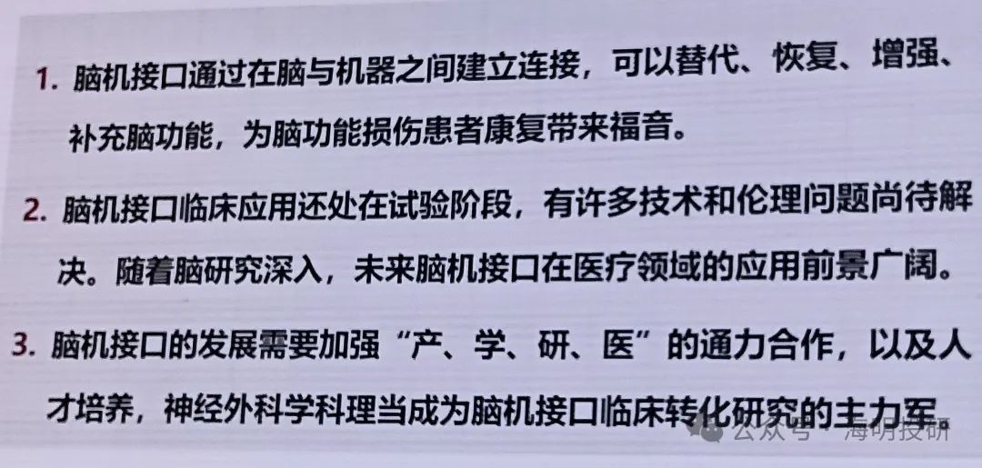 印象比较深的是在脑科学方向。患者昏迷了六个月仍然可以通过。脑科学的一些先进技术使患者苏醒。这在过去是不可想象的。对于脑科学来讲有两个核心技术。,一个是电极,另一个是电极发出信号的解读,这两者都是至关重要的。当然也提到了伦理问题。可能未来对很多人来讲已经没有秘密可言。就是你不说我也知道你大脑在想什么。