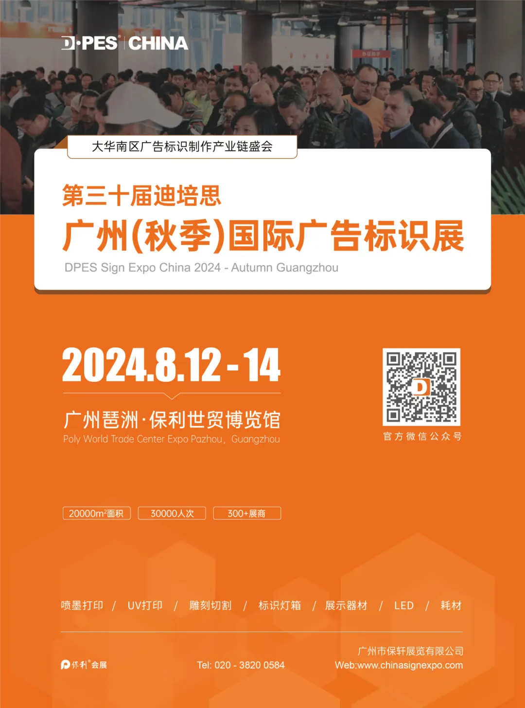 第二十九届迪培思(春季)广州国际广告标识及LED展(DPES Sign Expo CHINA 2024)落下了帷幕,为期三天的展览硕果颇丰!在大家的期盼和呼声中,2024第三十届迪培思(秋季)广州国际广告标识展正式启动!