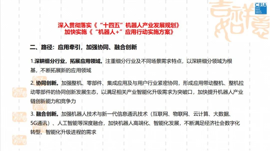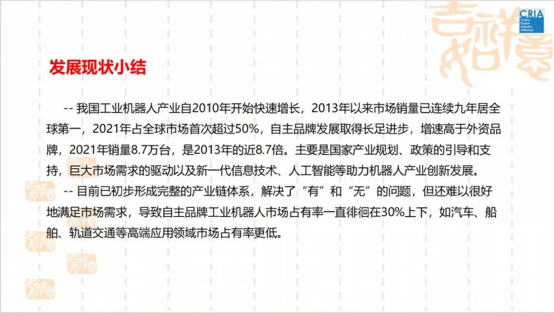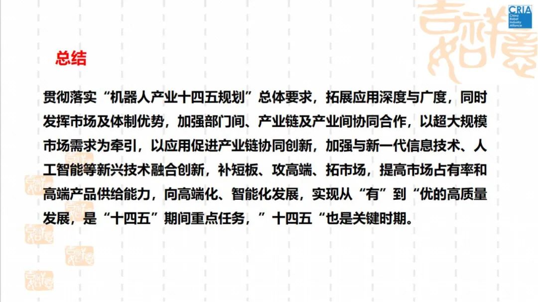 中国机械工业联合会机器人分会/中国机器人产业联盟副秘书长陈丹女士作主题为“深入实施《机器人产业‘十四五’规划》——攻高端、强基础、拓应用,推动工业机器人高质量发展”的大会主旨报告。该报告围绕国内外机器人产业的发展态势、现存的主要问题及差距、《机器人+心动实施方案》进行详细阐述。