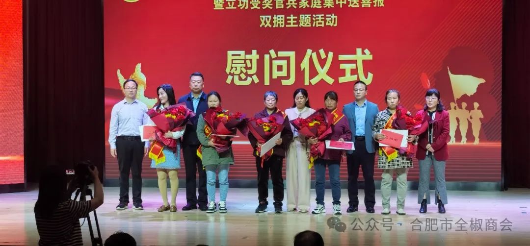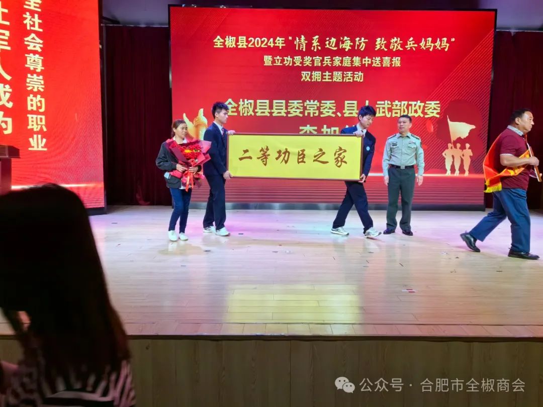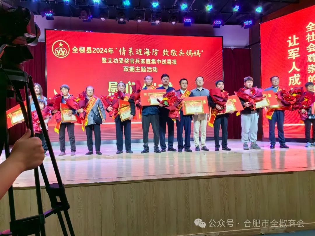 5月11日上午,在商会宗平会长的委托下,在商会秘书长韩俊的带领下,商会一行9人参加了全椒县2024年“情系边海防致敬兵妈妈”暨立功受奖官兵家庭集中送喜报拥军优属公益活动,商会具体参加人员有副会长赵俊辉、副会长赵国辉、副会长李继军、副会长井滕、理事王琛、理事吴昊、理事胡鹏、商会法律顾问张继斌、秘书长韩俊。据了解,这是合肥市全椒商会连续2年参加拥军优属的公益活动。