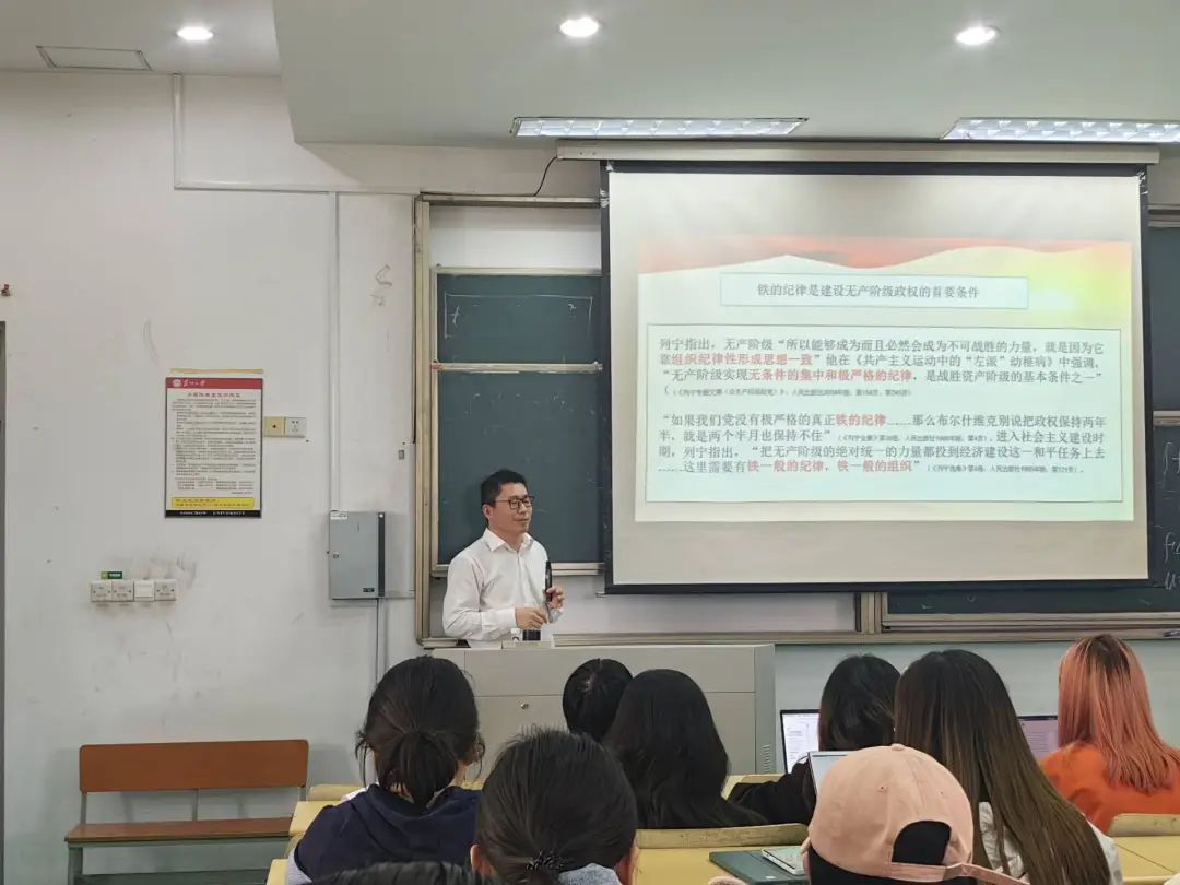 马克思主义学院副教授孔川老师以“模范遵守党的纪律,担当民族复兴重任”为主题进行授课,他围绕“严明纪律是建设坚强无产阶级政党的首要条件”、“铁的纪律是建设无产阶级政权的首要条件”和“党的纪律的核心是维护党的集中权威和团结统一”这三个方面,深入浅出地为我们解读了党纪的重要性和必要性,引导我们学纪、知纪、明纪、守纪,不断增强党性,强化组织意识。