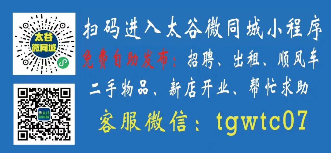 每 日 有 太 谷 免 费 招 聘、房 屋、转 让 等 信 息 :商 务合 作 联 微 信:tgwtc07