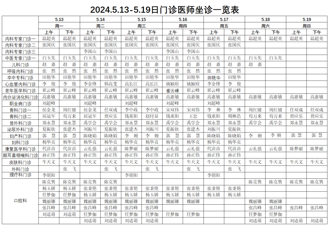 郑煤集团总医院2024年5月13日-5月19日门诊专家坐诊表