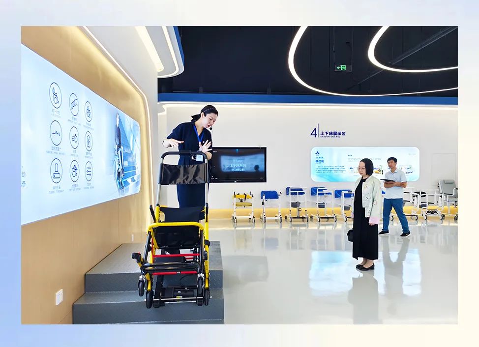 杨彦教授参观了作为科技桂林生产基地及智能护理数字化展厅,观看了大小便智能护理机器人、大小便智能护理床、智能行走机器人、电动爬楼机、多功能移位机、便携式洗浴机、电动折叠代步车等智能护理设备的场景演示及应用案例,深入了解了公司在智能护理领域的技术创新和产品应用情况。