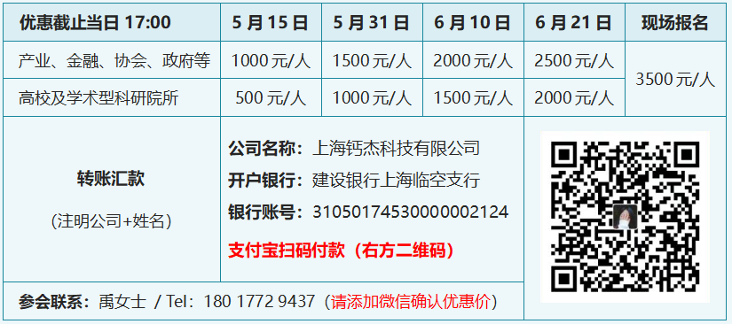 4. 享受折扣优惠价的参会人,除本人和本单位遇不可抗力因素以及会议取消外,因自身原因不能出席会议的,不能退款。报名前请阅读☞☞报名须知,报名成功者默认认可报名须知内容;