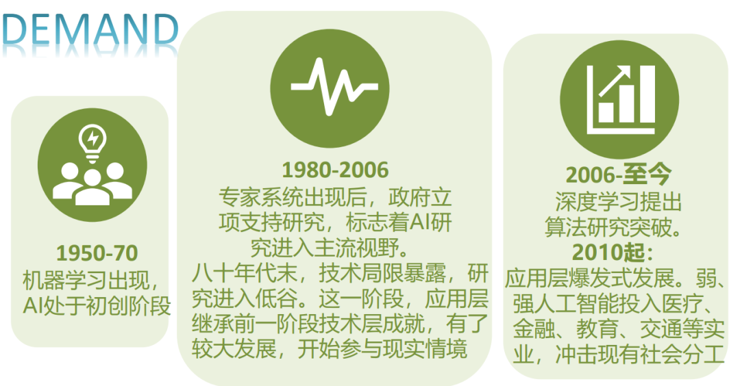讨论人工智能行业的过往与未来,不可能只谈业界不谈学界。是以,本队用气泡图来统计学界重要发现出现的时间和业界重要技术拐点出现的时间节点,以气泡大小反映发现的影响力和重要程度,以期从全局视角把握人工智能发展历程。