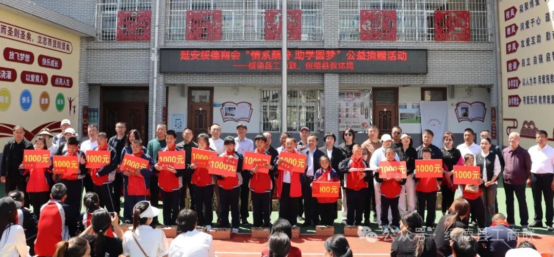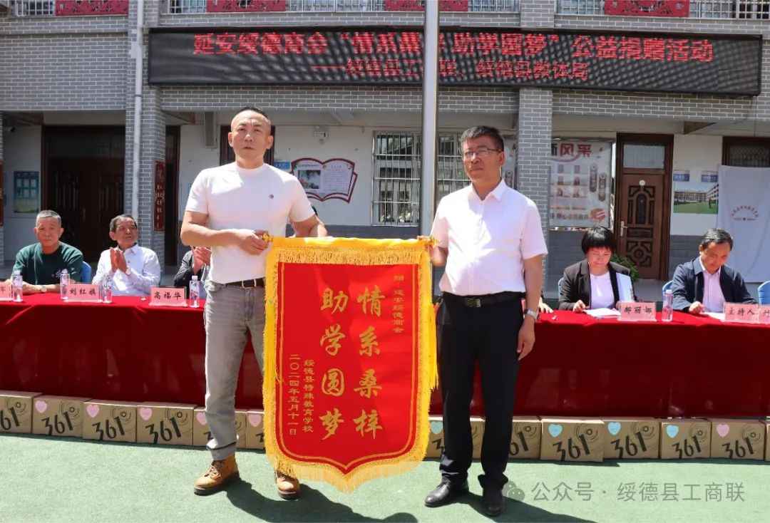 5月11日上午,延安绥德商会会长马建雄带领30多名会员企业家,来到绥德县特殊教育学校,为43名学生每人捐赠一双运动鞋和1000元助学金,捐款捐物总价值5万余元。特殊教育学校校长韩东岩向延安绥德商会回赠了锦旗。