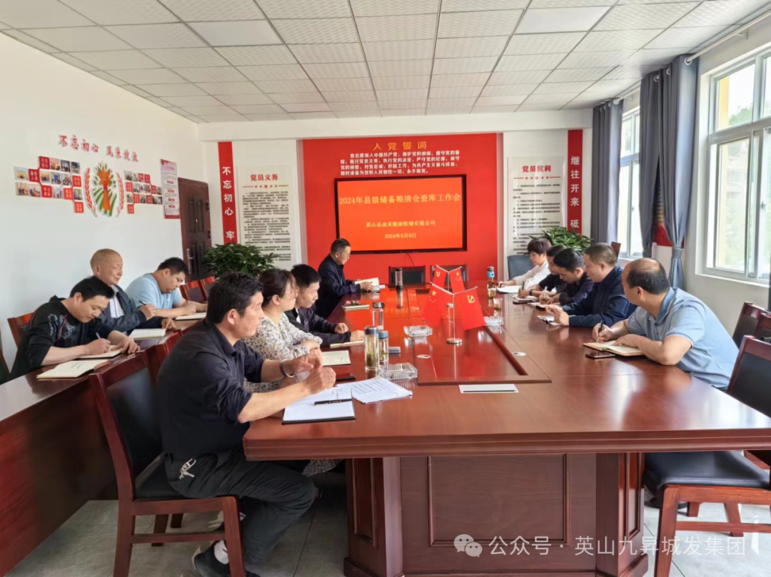 2024年县级储备粮清仓查库工作会在金禾公司会议室召开,县发改局、财政局、公检中心、集团工会主任郑凌及金禾公司全体干部职工参加会议。