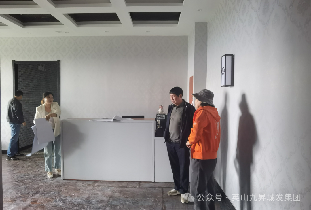 养老运营公司总经理潘阿明与英山县康养产业发展中心相关负责人探讨研究功能房间陈设与布局。