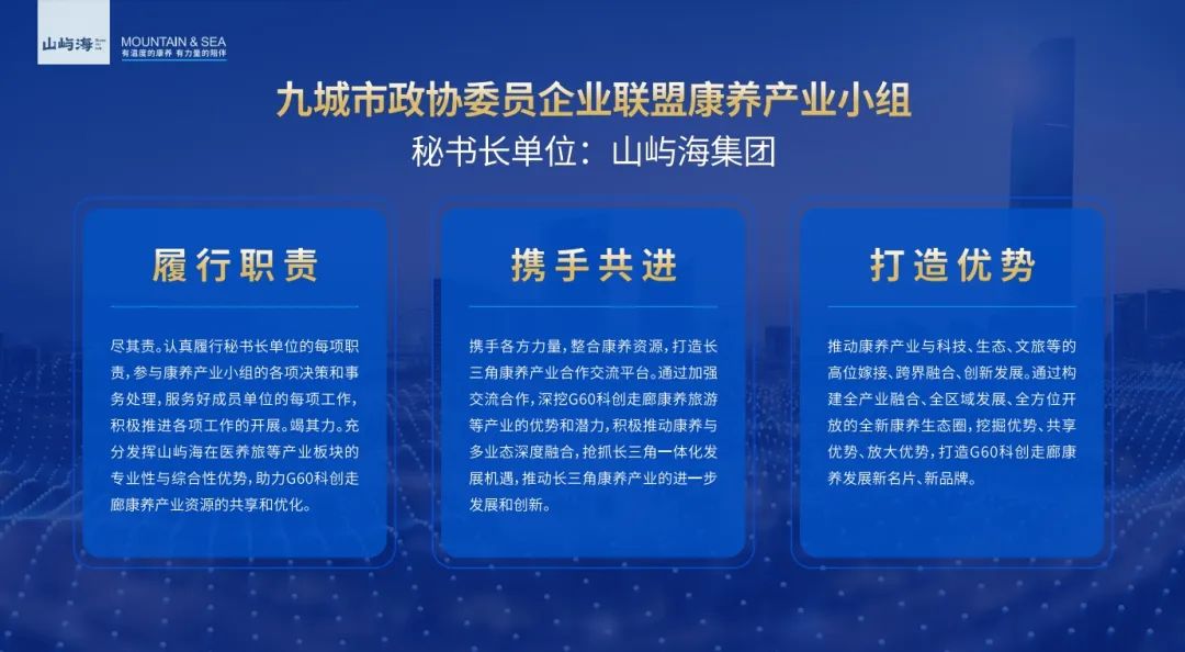 下一步,山屿海集团将充分发挥康养产业小组的桥梁纽带作用,以九城市政协组织为工作引领,依托各地优质资源禀赋,互为支撑,协同发展,不负使命,履职尽责,为谱写长三角康养产业发展新篇章,长三角一体化战略实施贡献山屿海力量!