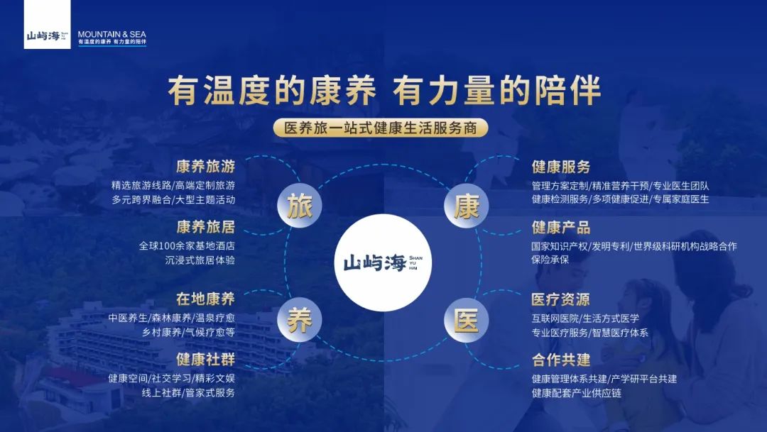 山屿海集团作为中国康养产业标杆企业,拥有广泛社会影响力、众多康养产业覆盖、先进管理运营理念、康养标准建设引领、突出自主创新能力等众多发展优势。山屿海始终以“延长人们健康生命时间”为使命,以“医、养、旅”三大产业板块发展为支撑,以“搭建并创新医养旅一站式大健康平台”为抓手,以探索医养旅一体化聚合发展产业新模式、新路径为重点,以文化资源、旅游资源与康养资源的统筹开发为动力,以“让更多人晚去或不去养老院,少去或不去医院”为服务目标,持续提升生态价值链、丰富产品供应链、延长康养产业链,在实现企业自身可持续健康发展的同时,充分发挥引领带动作用,以“山屿海经验”赋能长三角乃至全国康养产业的布局和发展。