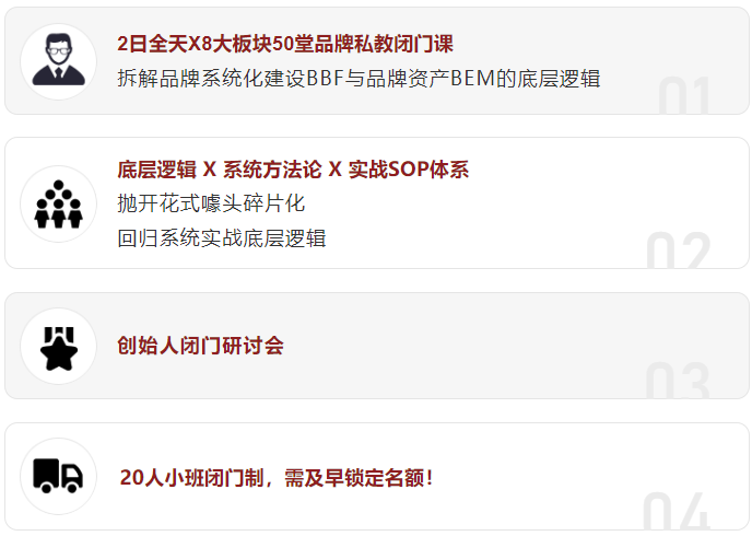 HBG多年来齐聚化妆品、食品、大健康、母婴、宠物、跨境、消费电子、家电、汽车、教育、科技、渠道等各行各业的企业家/创始人,每年与HBG一起,通过私教闭门课的形式,拆解品牌体系化背后的底层逻辑。