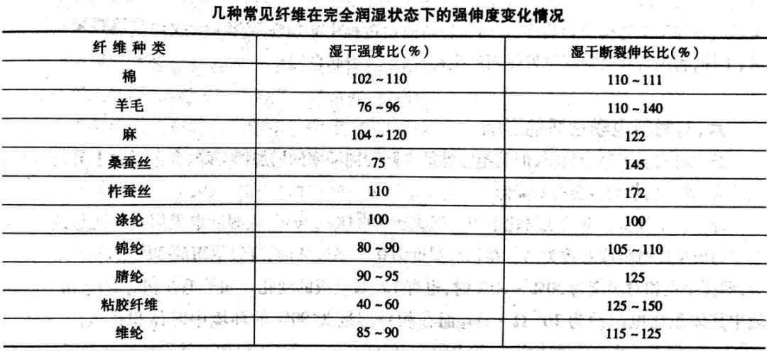 对于大多数纤维而言,其强力随着回潮率的增加而下降,少数纤维几乎不变,个别纤维(棉、麻)的强力上升。绝大多数纤维的断裂伸长率随着回潮率的增加而上升,少数纤维几乎不变。这主要由于水分子进入之后拆开了大分子之间的交联,分子间力减小,大分子易滑脱,故强力降低。
