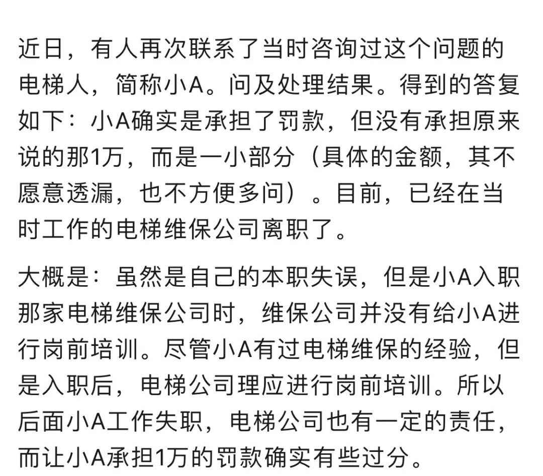 日前,网上出现一则电梯同行的求助信《被市监管罚款3万。电梯维保员被要求承担一万合理吗?》。