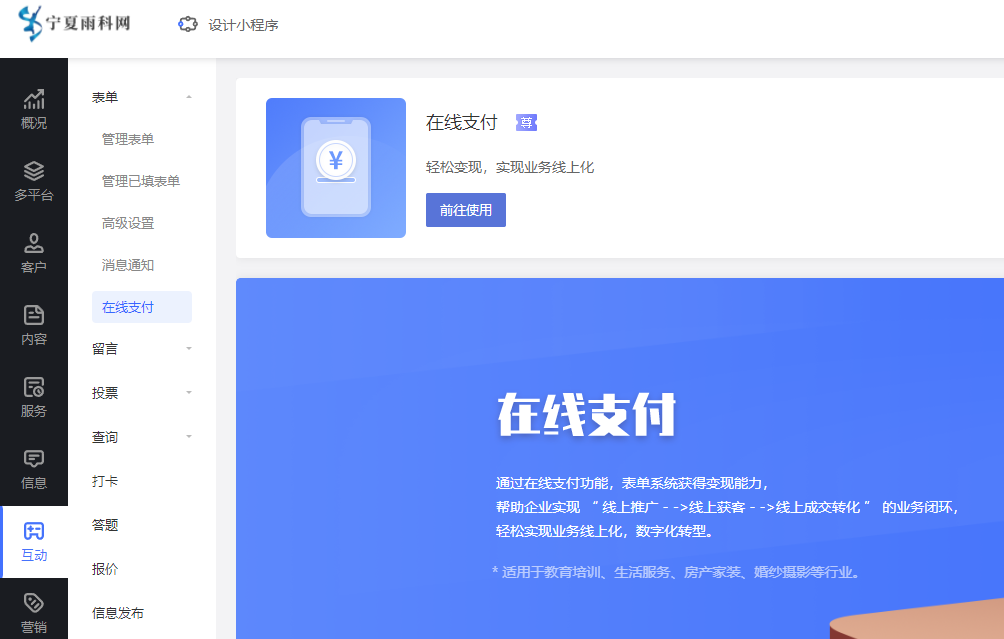 会展服务主要以展示和预约(支付)为主,但合理的互动营销也同样重要,除了表单,还有留言、投票、查询、报价等体系也同样重要,在商家发展路径中起到赋能效果。