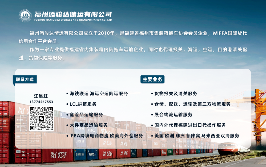 企业介绍:福州添骏达储运有限公司成立于2010年,是福建省福州市集装箱拖车协会会员企业,WIFFA国际货代信用合作平台会员。作为一家专业提供福建省内集装箱内陆拖车运输企业,同时也代理报关,海运,空运,目的港清关配送,货物保险等服务。