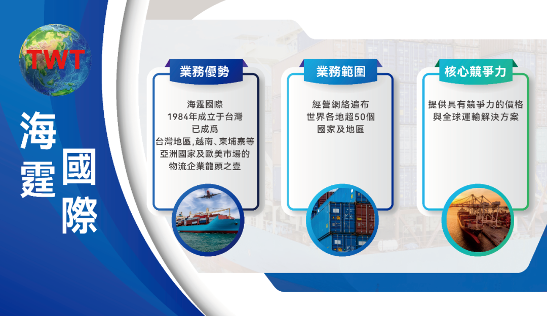 业务优势:海霆国际1984年成立于中国台湾,已成为台湾地区,越南、柬埔寨等亚洲国家及欧美市场的物流企业龙头之一 业务范围:经营网络遍布世界各地超50个国家及地区