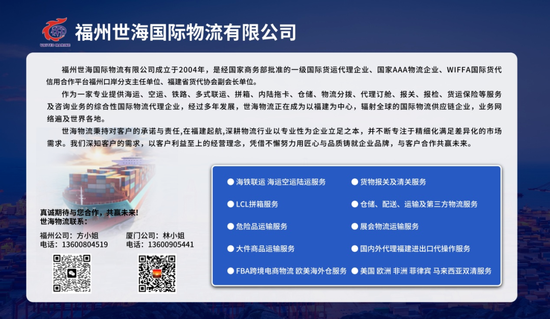 公司介绍:福州世海国际物流有限公司成立于2004年,是一家获得国家商务部认可的一级国际货运代理企业,国家AAA级物流企业。同时也是WIFFA国际货代信用合作平台福州口岸的分支主任单位以及福建省货代协会的副会长单位。世海物流提供全方位的国际物流服务,涵盖海运、空运、铁路、多式联运、拼箱、内陆拖卡、仓储、物流分拨、代理订舱、报关、报检和货运保险等多个领域。该公司以福建为中心,业务网络遍布全球。世海物流坚持客户至上的经营理念,专注于精细化服务以满足不同市场需求,通过不懈努力和匠心品质,与客户共创美好未来。