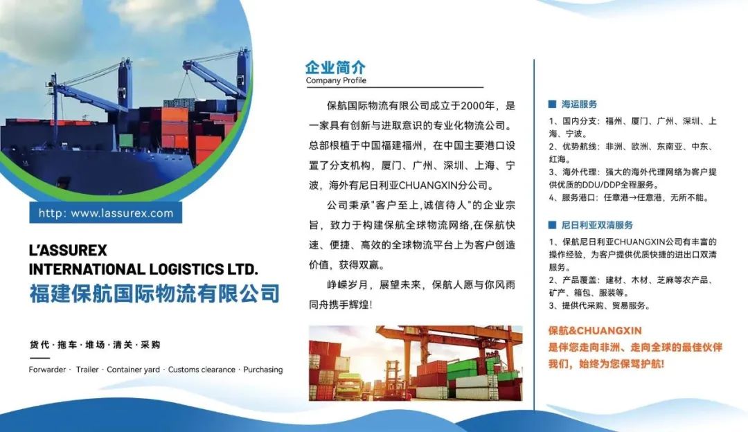 1.保航尼日利亚CHUANGXIN公司有丰富的操作经验,为客户提供优质快捷的进出口双清服务。 2.主要产品覆盖:建材、木材、芝麻等农产品、矿产、箱包、服装等。 3.提供代采购、贸易服务。 联系方式:郑祯容 15960095066