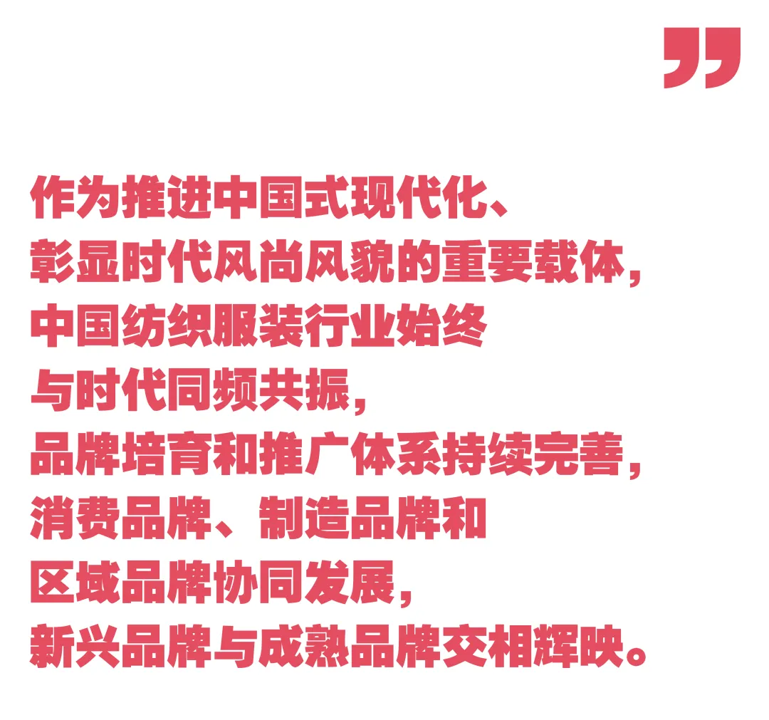 围绕2024中国品牌日“国货潮牌,品筑未来”的活动大主题,纺织服装行业会议以“品牌新质 未来新光”为主题,旨在立足于纺织服装品牌发展的现实语境,打造具备高科技、高效能、高质量特征,符合新发展理念的先进生产力质态,面向国货品牌的崛起与文化自信的提升,建树属于中国品牌,掷地有声的时尚话语。在此,我谨代表中国纺织工业联合会对本次会议的成功召开表示祝贺!对国家发展和改革委员会多年以来的指导和支持表示衷心的感谢,对长期关心和支持行业发展的各界来宾朋友表示诚挚的欢迎!感谢真维斯品牌对本次活动的大力支持!作为推进中国式现代化、彰显时代风尚风貌的重要载体,中国纺织服装行业始终与时代同频共振,品牌培育和推广体系持续完善,消费品牌、制造品牌和区域品牌协同发展,新兴品牌与成熟品牌交相辉映。在这股强大的发展浪潮中,我们欣喜地看到,中国纺织服装品牌正在加快发展新质生产力,以前所未有的速度和深度,在多个领域实现突破与创新。第一,科技生产力正在支撑品牌加速引领品质新生活。从衣被天下到上天入地,中国纺织服装品牌始终走在科技创新的前沿,依托网络化协同、平台化设计、智能化制造,推动制造创新、材料创新、产品创新系统性发展,颠覆性创意、智慧型营销、沉浸式体验不断延展,新领域、新业态、新场景加速创造,为美好品质生活注入澎湃活力。第二,文化生产力正在引领品牌加快生产时尚新流行。伴随文化自信下的“血脉觉醒”与“国潮新生”,以新中式美学为代表的中国文化消费景观正在形成,越来越多的中国纺织服装品牌在加速东方美学的创新表达与文化应用中,不断带动国潮品牌焕发时代光彩。第三,绿色生产力正在助力品牌加大开拓产业新空间。在可持续消费成为全球共识的背景下,中国纺织服装品牌从更宏大的产业生命周期出发,积极推崇可持续时尚主张和“天人合一”价值观,围绕绿色研发、绿色生产、绿色流通、绿色消费、绿色投资展开积极实践,为全球时尚产业和消费形态注入新的活力。今年,中国纺联正在筹备《品牌价值评价 纺织服装、鞋、帽业》国家标准(GB/T31278-2014)、《品牌培育管理体系实施指南 纺织行业》行业标准(FZ/T01142-2018)两项标准的修订工作,以体现新时代行业品牌建设的价值新参数与模式新路径;优势企业拥有的高品牌价值,凝结着高品牌收益与高品牌强度。本次会议现场,也将重磅发布“2024中国纺织服装品牌竞争力优势企业”名单,向全社会展现中国纺织服装品牌的新面貌、新图景。一是深挖价值,强化“专业”,让新创造探向需求更深处。一方面,要加强产业链关键环节、关键领域、关键产品的标准制定,强化技术应用、协同创新和产业协作,提升“中国制造”品牌的话语权;另一方面,要构筑支撑品牌价值持续成长的底层基石,强化品质创新、质量管理和经营效率,全方位提升智能化、精细化、差异化商品和服务供给能力,向世界输出中国现代化产业发展经验。二是创新叙事,强化“独特”,让新内容探向精神更深处。一方面,依托国潮文化的崛起与文化自信的提升,主动探索中国式风格化表达,联动当下潮流与传统优秀文化,营造多元化穿衣风格和生活图景,构建更柔性、更强大、更长远的品牌力量;另一方面,要从全球文化资产出发,积极探索时代情绪和文化势能,以更加鲜活有趣的打开方式,向世界展示中华民族宏大包容的文化内涵与精神气质。三是精准布局,强化“联结”,让新体验探向生活更深处。一方面,要依托产业优势及发展土壤,在多元的审美样态和体验需求中,深度挖掘细分领域内在消费潜力,全面构建从国内市场到全球市场的商业闭环;另一方面,要借助消费节、创意市集、时装周、商贸展等多重业态,呈现独具特色的品牌美学与市场韧性,在更具全球化和长期意义的品牌突围中,推动“中国时尚”成为新的“世界时尚”。龙腾万里攀云霄,今日华夏起雄风。今天,中国品牌如潜龙出渊,快速崛起,昂首阔步,走向世界。这是我们华夏儿女的骄傲,更是我们民族工业的荣光。未来,让我们心怀信仰、携手共进,以创造之力、品质之诚、文化之光,让中国纺织服装品牌向新而生,向新而进,向新而强,共创中国品牌时代新纪元!声明:本文不用于商业用途,仅为学习交流之用。部分资料、素材、文字、图片等来源于互联网,所有转载都已经注明来源出处。如有侵犯您的知识产权以及个人合法权益的作品,请及时联系我们删除,联系邮箱:bzfangxie@126.com。