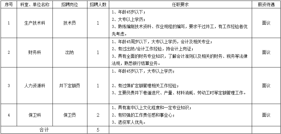 贵州赣兴煤业有限公司属江煤贵州矿业集团有限公司(国有企业)全资子公司,位于纳雍县阳长镇境内。现因公司经营发展需要,特面向社会公开招聘生产技术人员1名、出纳1名、井下定额员1名、保卫员2名。