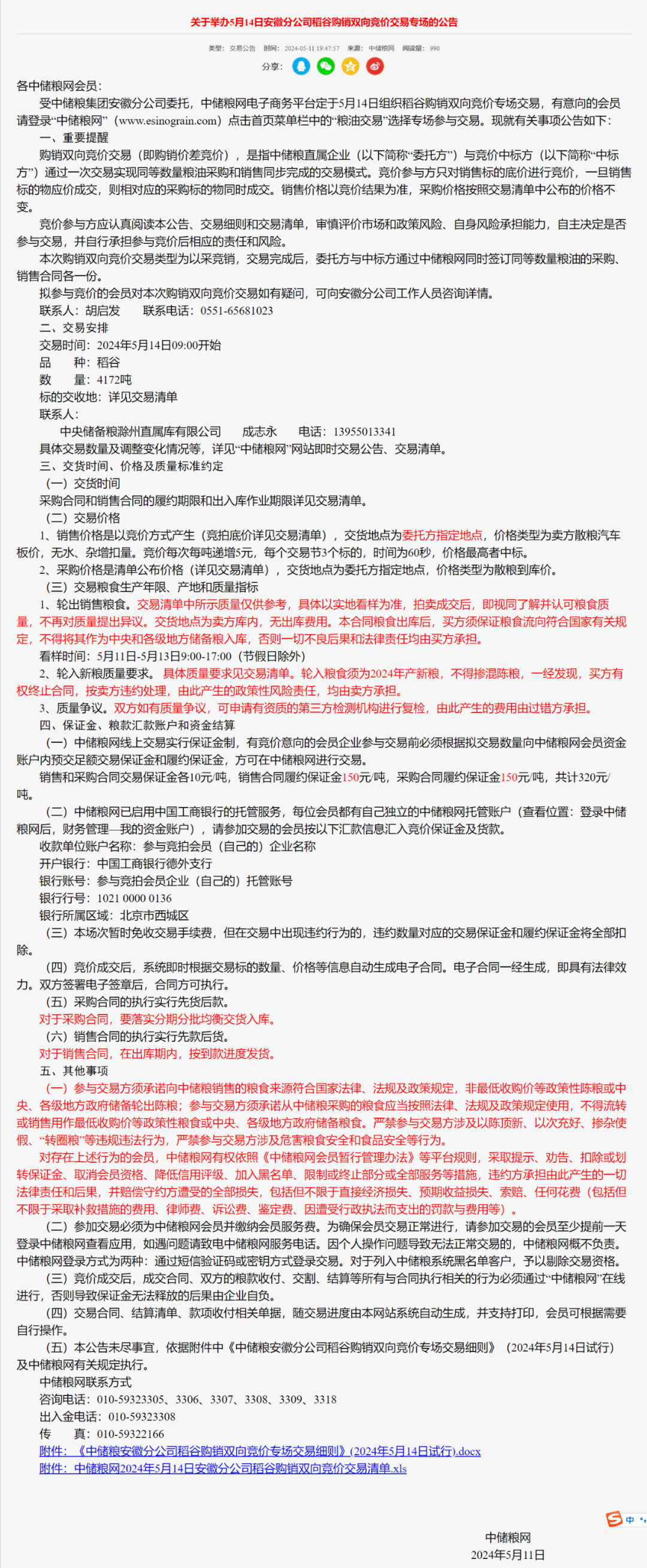 关于举办5月14日安徽分公司稻谷购销双向竞价交易专场的公告