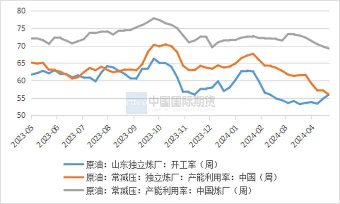 沥青成本回落及需求平淡或令上半年沥青裂解修复空间受限,利润亏损下部分炼厂产量兑现难度仍然较大。当前需求释放进度有限,整体开工率仍处于相对低位。国内基础工业数据向好为市场提供一定支撑,资金面趋紧背景下,沥青上行驱动预计较为有限。4月原油市场震荡运行,美联储降息预期有所改善,美元强势及需求端压力抑制油价上行驱动。地缘因素对油价的支撑延续,OPEC+定于6月初召开会议以决定减产政策。地缘政治风险及OPEC 减产支撑油价。地缘紧张局势升温,潜在供应风险仍然存在,全球经济放缓和地缘事件对油价交替构成影响。地缘局势的驱动与经济需求放缓并存,油价4月震荡运行。4 月沥青市场现货价格震荡运行,成本支撑较为明显,市场需求持续南北分化,现货价格窄幅震荡。国内沥青供需双淡格局延续,炼厂及社会库资源去库缓慢,国内社会库存去库,厂库库存小幅去库,北方地区库存水平可控。当前沥青需求趋于疲软,市场囤货意愿不强,利润亏损下部分炼厂产量兑现难度仍然较大。炼厂整体开工仍处于相对低位。当前沥青需求释放进度有限,北方需求有所抬升,南方雨季抑制刚需释放。国内基础工业数据向好为市场提供一定支撑,资金面趋紧背景下,沥青预计延续震荡运行。美国商务部发布数据显示,美国2024年一季度实际GDP年化季环比初值增长1.6%,远不及市场预期的2.5%,较去年四季度的3.4%大幅放缓。海关总署网站4月12日发布的数据显示,中国3月原油进口量为4,905.2万吨,1-3月原油进口量为13,735.6万吨,较去年同期增长0.7%。中国3月成品油进口量为460.2万吨,1-3月成品油进口量为1,217.6万吨,较去年同期增长27.5%。中国3月天然气进口量为1,075.8万吨,1-3月天然气进口量为3,279.3万吨,较去年同期增长22.8%。数据还显示,中国3月成品油出口量为601.6万吨,1-3月成品油出口量为1,481.9万吨,较去年同期下滑18.3%。美国商品期货交易委员会(CFTC)最新公布的数据显示,截至4月23日当周,投机客减持美国原油期货多仓至381478手,空仓减持至116642手,净多头头寸环比减少25626手,至264836手。截至4月23日当周,伊朗和以色列互相攻击之后,双方都相对克制,冲突恶化的可能性有所降低,前期因避险需求带来的原油地缘溢价面临出清。原油市场情绪从过度兴奋到反转,多空双方在震荡中重新寻求平衡。在此背景下,原油多空双减,净多头连续三周出现回落。拜登政府重新对委内瑞拉实施石油制裁,结束为期六个月的暂缓制裁。据美国商品期货交易委员会(CFTC):截至4月30日当周,WTI原油期货投机性净多头头寸减少17,887手至157,101手;NYMEX、ICE市场的天然气期货净空头寸增加7,547手合约至19,865手。据国家统计局数据,一季度国内生产总值296299亿元,按不变价格计算,同比增长5.3%,比上年四季度环比增长1.6%。分产业看,第一产业增加值11538亿元,同比增长3.3%;第二产业增加值109846亿元,增长6.0%;第三产业增加值174915亿元,增长5.0%。一季度,全国固定资产投资(不含农户)100042亿元,同比增长4.5%,比上年全年加快1.5个百分点;扣除房地产开发投资,全国固定资产投资增长9.3%。分领域看,基础设施投资增长6.5%,制造业投资增长9.9%,房地产开发投资下降9.5%。全国新建商品房销售面积22668万平方米,同比下降19.4%;新建商品房销售额21355亿元,下降27.6%。拜登政府重新对委内瑞拉实施石油制裁,结束为期六个月的暂缓制裁。地缘因素对油价的支撑延续,OPEC+定于6月初召开会议以决定减产政策。4 月 19 日当周,美国原油产量为 1310 万桶/日,环比持平;美国石油钻井数量 511 台,环比+5 台;美国炼厂开工率 88.50%,较前一期增长 0.4 个百分点。 据外电 4 月 23 日消息,国际货币基金组织(IMF)预计石油输出国组织(OPEC)及其伙伴将从 7 月开始逐步增加石油产量,这一转变将使沙特阿拉伯明年重新成为世界上增长最快的经济体之一。据4月29日讯,国际船东互保协会(International Group of P&I Clubs)表示,七国集团对俄罗斯石油价格设定的上限正变得越来越难以执行。该协会的调查报告中表示,大约800艘以前由其成员组织承保的油轮已转移到影子船队。此外,保险公司也没有办法检查交易员是否遵守价格上限。随着俄罗斯将船只从西方监管中剥离,对该协会成员服务的需求正在减弱。航运数据显示,今年4月,只有16%的俄罗斯货物由成员公司承保。数月来,俄罗斯旗舰乌拉尔原油的公布价格一直远高于每桶60美元。据中国石油新疆油田,我国首个国家级陆相页岩油示范区——吉庆油田作业区,一季度页岩油产量达21.5万吨,目前页岩油日产达2800吨,均创历史新高。自今年1月以来,新疆油田吉庆油田作业区新开钻井53口,钻井进尺累计达28万米。目前已完成40口钻井作业,平均完井周期34天,钻井效率较去年同期提高5%。根据MYSTEEL资讯显示,主营炼厂常减压产能利用率为77.59%,环比下跌0.23%,镇海炼化检修继续小幅降负荷。中国成品油独立炼厂常减压产能利用率为55.95%,环比上周下跌1.17个百分点。炼厂端利润空间有所收窄,东北大区部分独立炼厂轮检开始,国内独立炼厂开工负荷降低。OPEC+延续减产、地缘局势等因素使得供给端不确定性抬升,供给趋紧将对原油价格继续形成支撑。截至4月26日当周,EIA原油库存增加726.5万桶至4.61亿桶,预期减少110万桶,前值减少636.8万桶;当周库欣原油库存增加108.9万桶,前值减少65.9万桶。当周美国战略石油储备(SPR)库存增加59.4万桶至