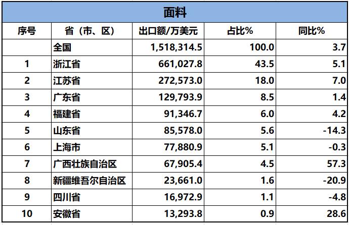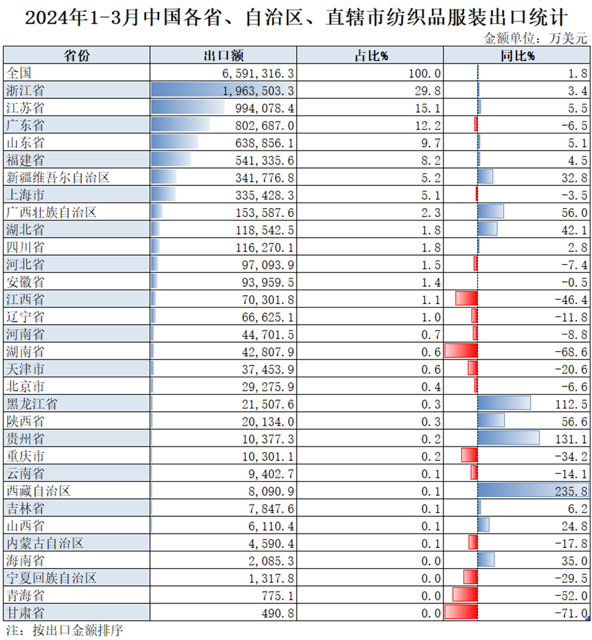 2024年1-3月,我国纺织服装累计出口659.13亿美元,同比增长1.8%。内地31个省、自治区、直辖市纺织服装统计数据已出炉,浙江省、江苏省、广东省、山东省、福建省分别列全国纺织服装出口省市前五位,合计比重超七成。