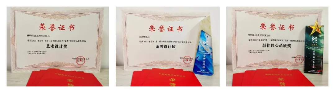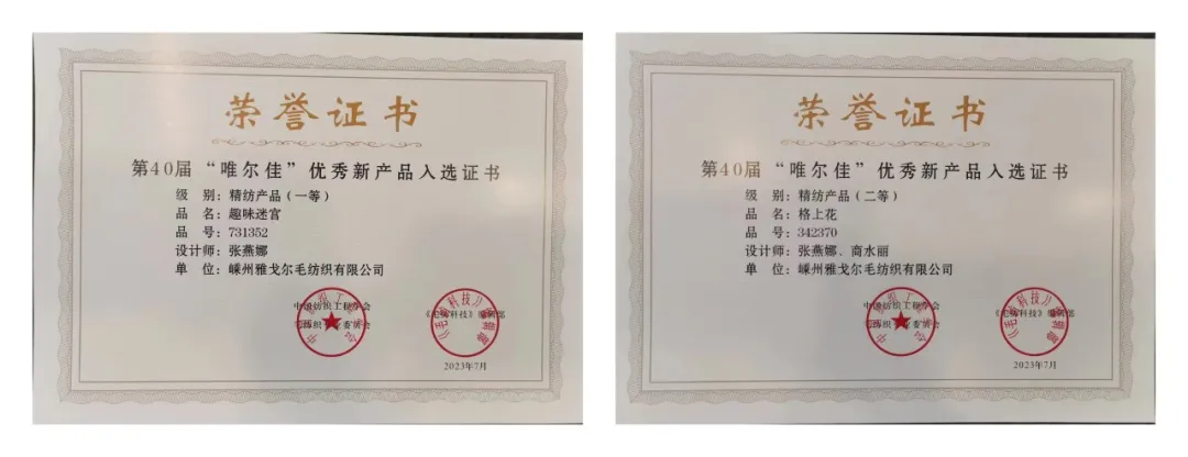 张燕娜开发设计的多款面料在中国毛纺织“金典”名优精品评比、“唯尔佳”优秀新产品评比、中国流行面料设计大赛中获奖,2023年荣获第二届全国毛纺面料“金牌设计师”称号。
