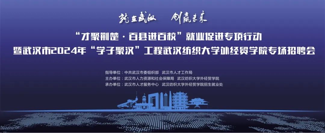 为深入贯彻党的二十大精神,全面落实就业优先政策,加快推进“学子聚汉”工程,促进高校毕业生高质量就业,“才聚荆楚•百县进百校”就业促进专项行动暨武汉市2024年“学子聚汉”工程武汉纺织大学外经贸学院专场招聘活动将于5月14日(周二)在武汉纺织大学外经贸学院(藏龙岛校区)新操场举行。预祝同学们求职成功!