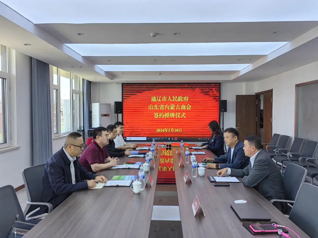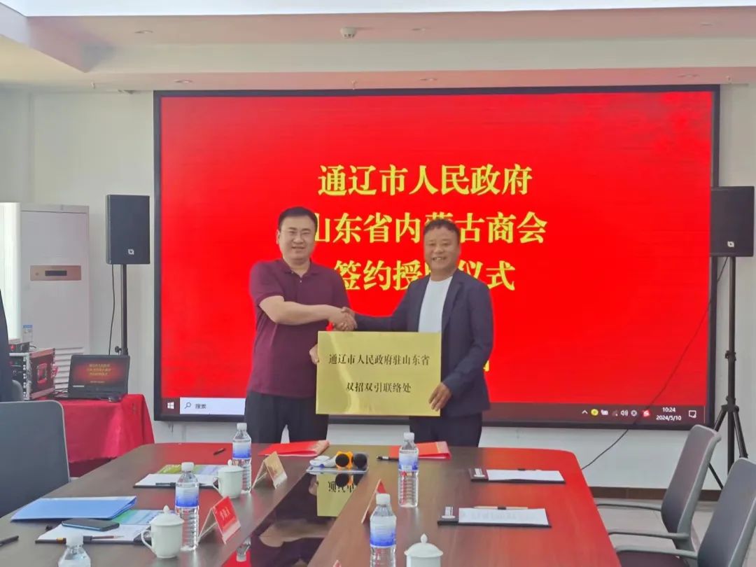 5月10日上午,通辽市人民政府驻山东省双招双引联络处在我会成功落成。通辽市投资促进局副局长康君、投资促进局商务联络科科长李海天、驻点招商处副处长谭昌龙、招商处工作人员赵子健,山东省内蒙古商会会长韩振涛、副会长兼支部书记高志宏、副会长兼会员部部长张威等参加本次授牌仪式。