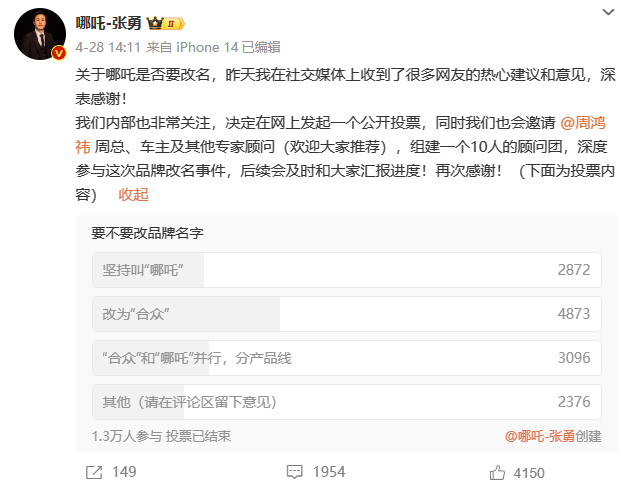 4月28日,为正面应对舆论质疑,哪吒汽车首席执行官张勇通过社交媒体发起民意调查,邀请广大网民就是否更改品牌名称发表意见,此举引发了正反两面的反馈。上汽通用五菱的副总周金开建言:汽车品牌更名非明智之举,历史并未见证成功案例,强调品牌命运应自主掌控。张勇则礼貌回应了周金开的关切,并提及四川与重庆地区的网友反馈称“哪吒”读音确有不便,之前的“锤子手机”也遭遇过类似诟病。